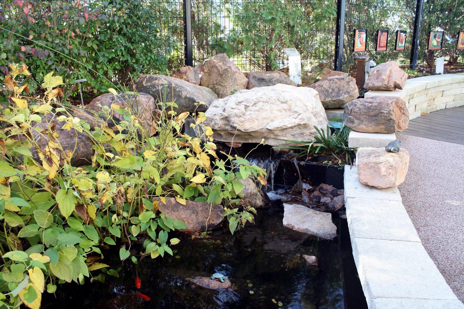 In October I had the pleasure of visiting the Olson Family Garden at St. Louis Children’s Hospital (in St. Louis, Missouri). The staff horticultural therapist kindly gave me a tour of this delightful space. Built in the late 1990s, this 8,000-square-foot rooftop garden is dominated by a lush array of greenery, mostly in raised planters, and also seasonally in movable pots. An abundance of plant materials is important in any type of outdoor healing setting. This space also includes winding paths; stepping stones through a shallow pool; fountains; interesting and fanciful art pieces; a goldfish pond; various resting spots; movable furniture; and telescopes for viewing a large park near the hospital grounds. Furthermore, the garden is lit for nighttime access and viewing.