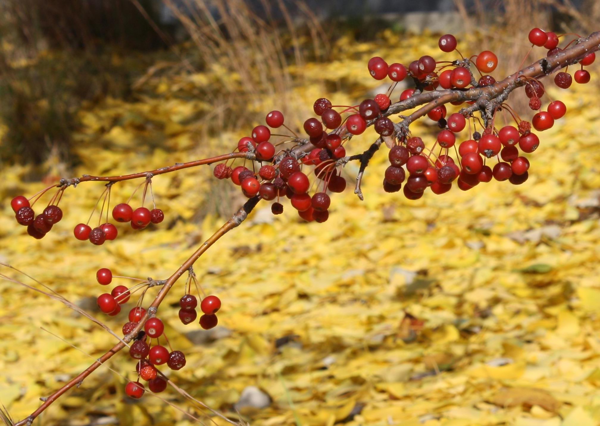Crabapple fruit against a backdrop of fallen Ginkgo leaves