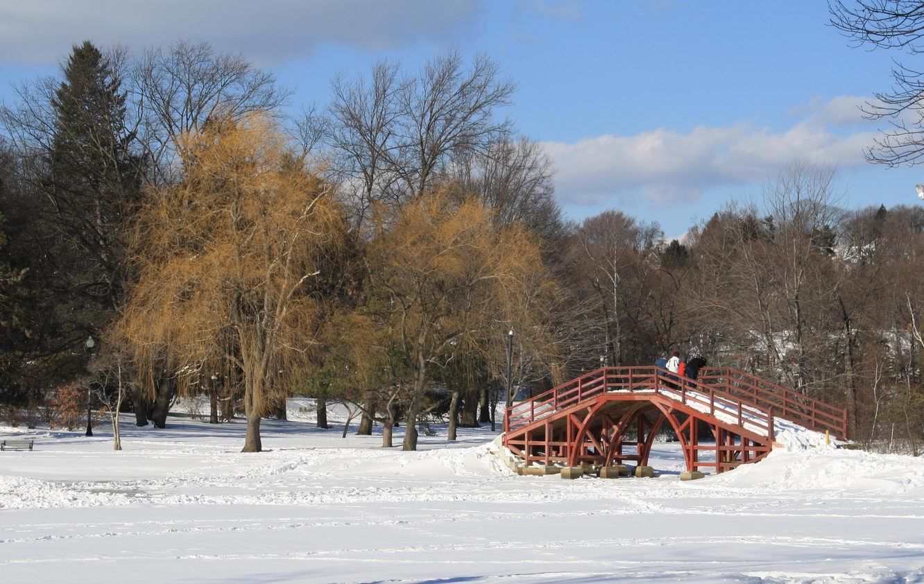 Brightly-colored Weeping Willow branches enhance a snowy park scene.