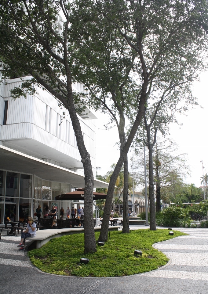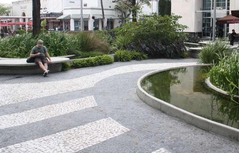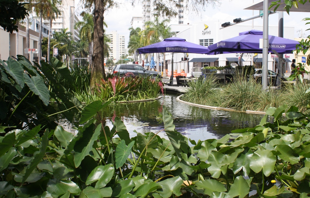 The Lincoln Road pedestrian mall in Miami Beach includes a relatively new addition: a block of water gardens that evoke Florida’s Everglades. The site was designed by the landscape architecture firm of Raymond Jungles, Inc., and construction was completed in 2010. The surfaces of the water gardens are raised above the surrounding pavement, and include many native plants such as Bald Cypress, Red Mangrove, and Pond Apple. The biomorphic shapes of the gardens and seats are juxtaposed with the bold linear pattern of the surrounding pavement, creating an interesting combination of urban and natural themes.