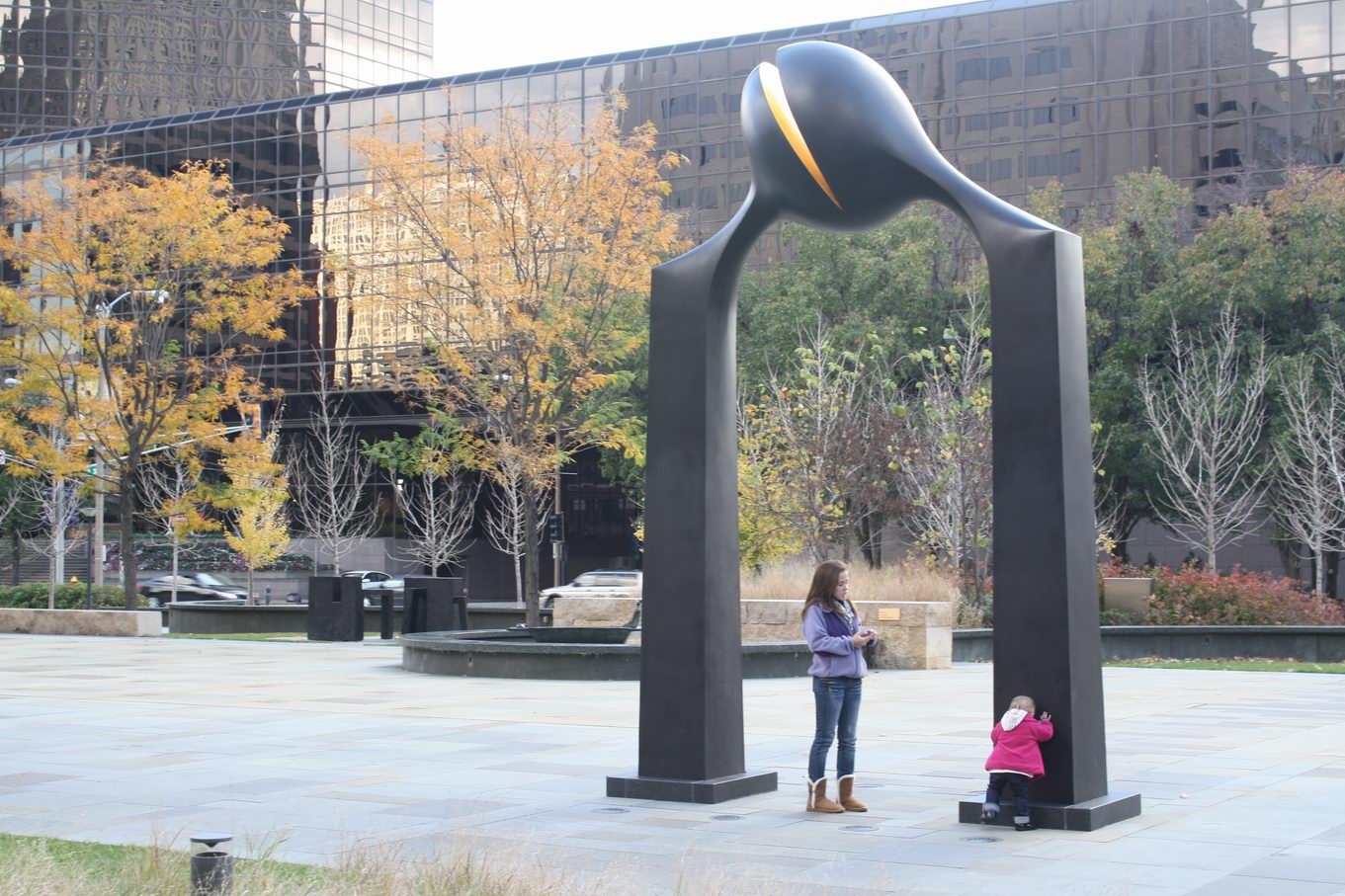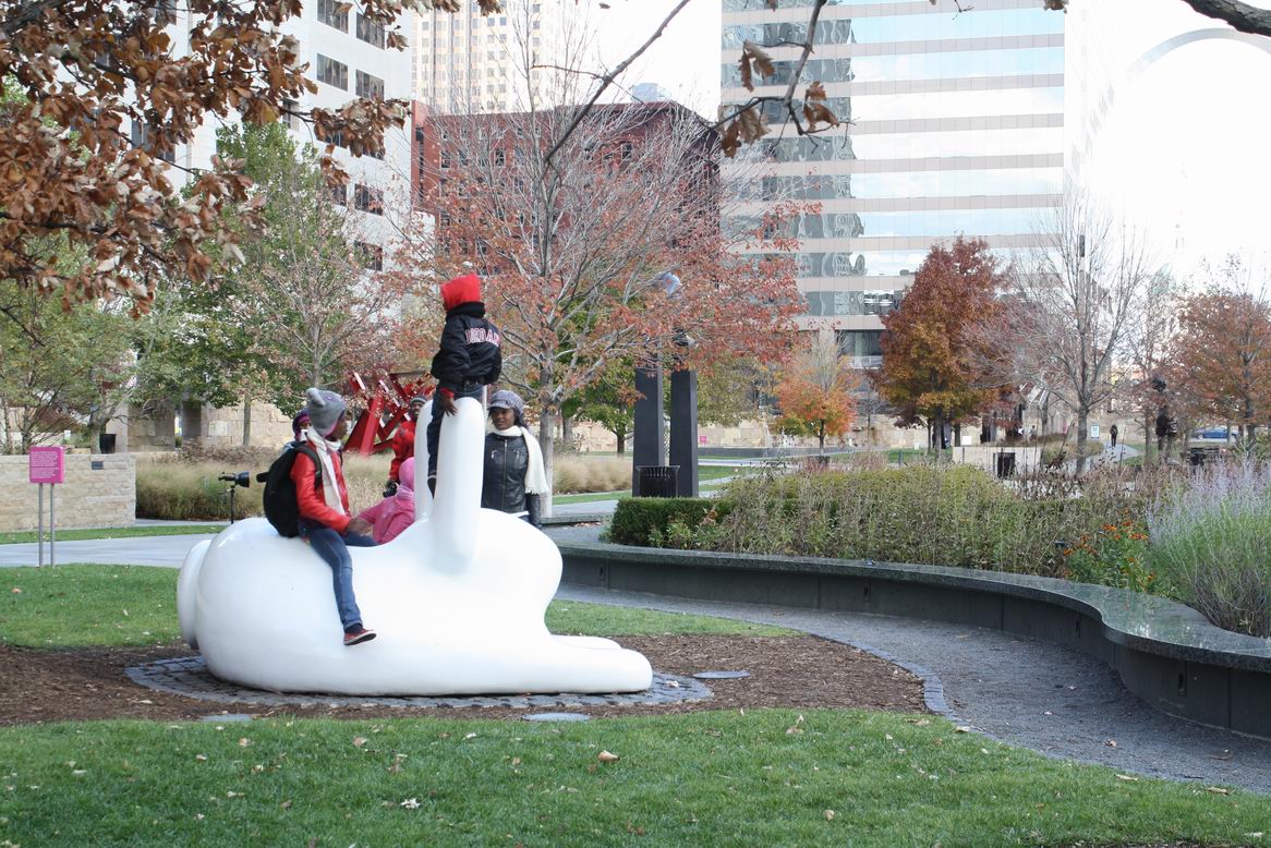 All features at Citygarden are meant to be experienced – there are no “Do not touch” signs to be found at the park. In warmer months, a thin sheet of water runs down the Tilted Disc in front of this sculpture.